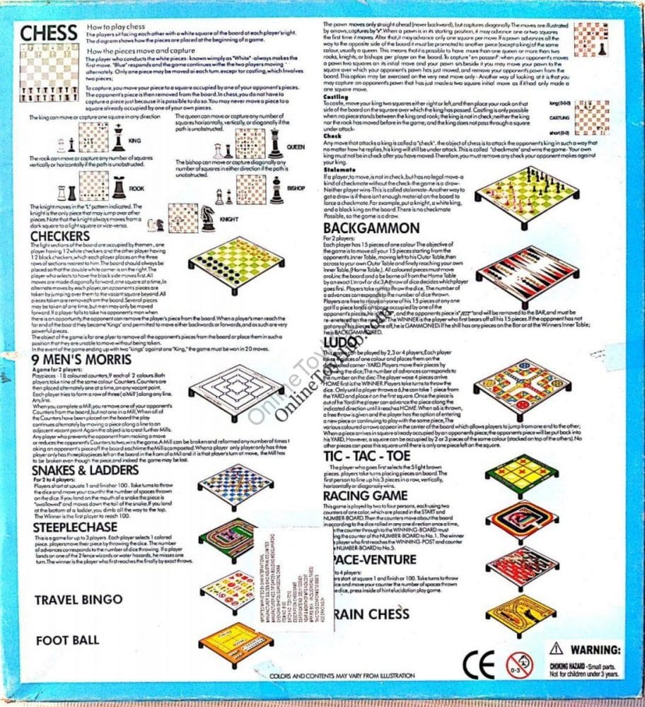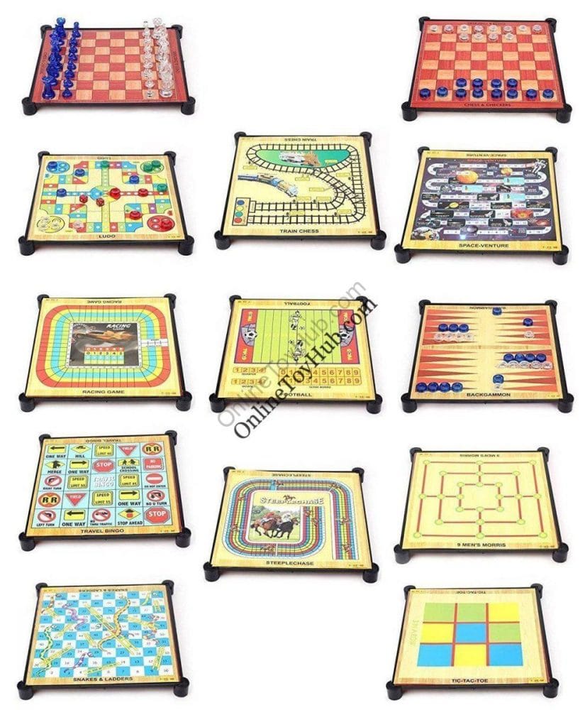 - Includes Games like 9 Men’s Morris, Chinese Checkers, Space-Venture, Steeple Chase, Backgammon, Racing Game, Tic-Tac-Toe, Chess, Checkers, Ludo, Snakes & Ladders.
