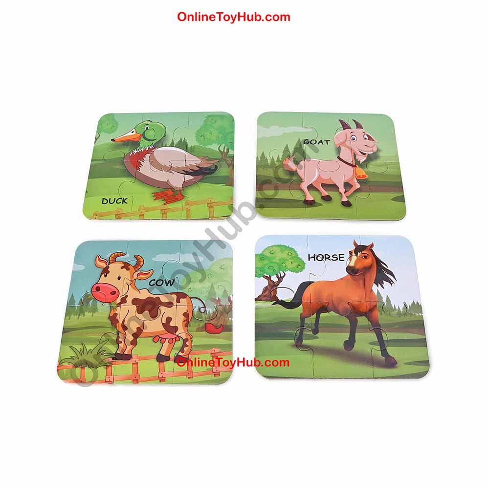 The puzzle comes with a set of 24 jigsaw puzzle pieces from which 4 Farm animals. The product not only helps in enhancing the hand-eye coordination but also forms a strong base for their cognitive development by improving their vocabulary. Also fostering the concept of gestalt thinking, i.e., understanding the concept of things as a whole, when the children put various pieces together to form an animal picture. It is proven that children learn better through visual content, hence the colourful pictures helps them in fostering the concept of colours and picture recognition and building their motor skills stronger. The children could also learn the numbering system with the number of pieces provided in the set. The puzzle pieces are made of non-toxic material and comes in compact sizes making them easier to hold for children.