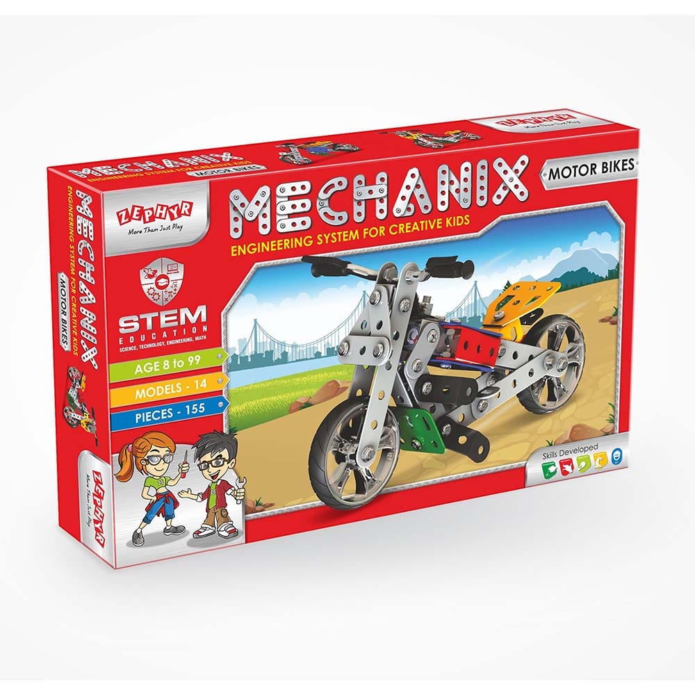 Learn the art of designing and construction through creative play. The box contains 155 pieces of versatile and reusable parts to give your child endless hours of fun. This mechanix series helps your child being creative, improves dexterity, reasoning and knowledge. This Kit Comes With All The Tools, And Parts To Build 14 Different Models of beautiful bikes, One At A Time. After Completing These 14 Models, The Builder Can Use The Nuts Bolts.