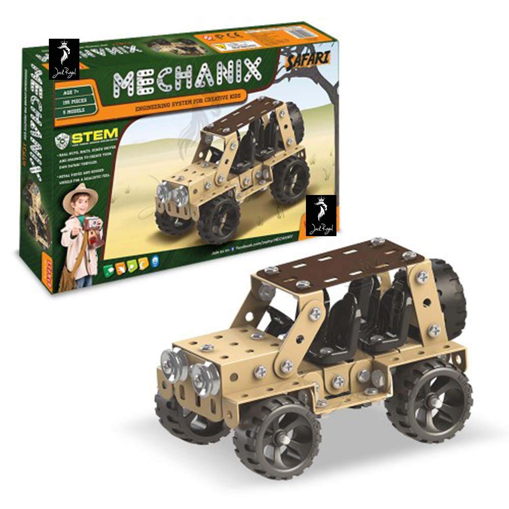 Learn the art of designing and construction through creative play. The box contains 155 pieces of versatile and reusable parts to give your child endless hours of fun. This mechanix series helps your child being creative, improves dexterity, reasoning and knowledge. This Kit Comes With All The Tools, And Parts To Build 5 Different Models of Safari vehicles, One At A Time. After Completing These 5 different models of Safari vehicles, The Builder Can Use The Nuts Bolts.