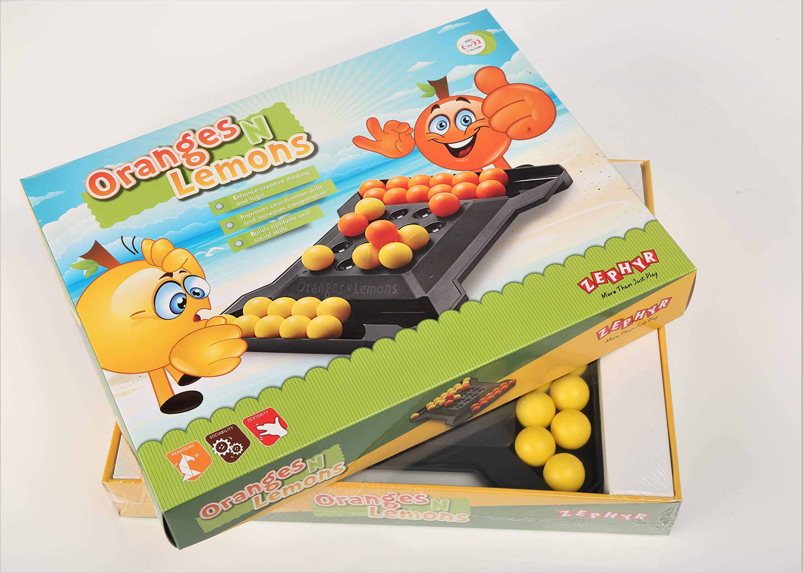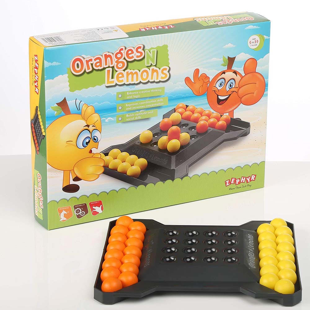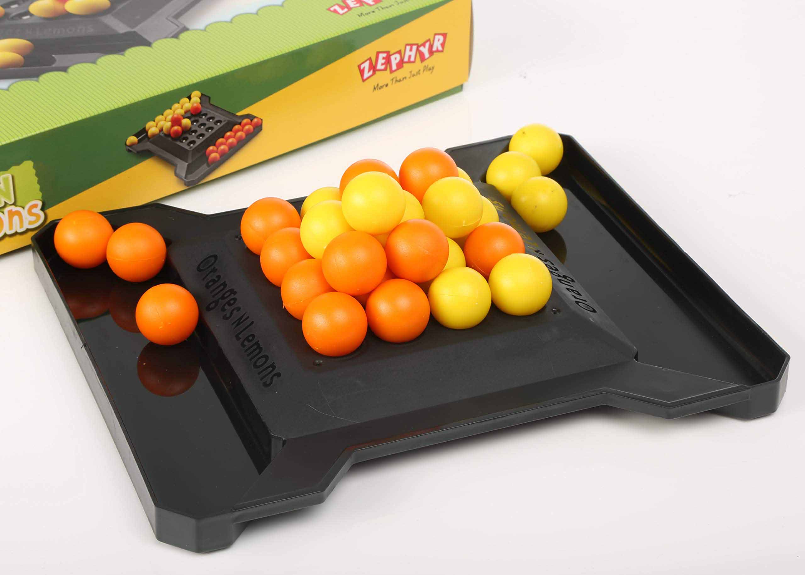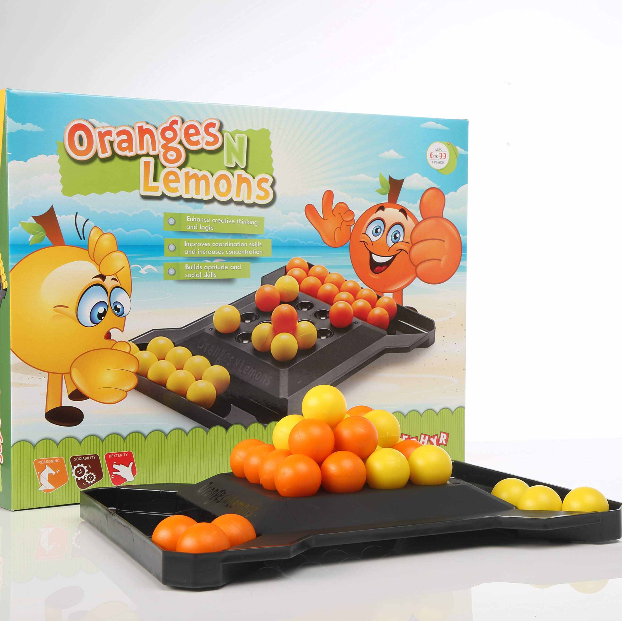 HOW TO PLAY : Objective of this game is to place ball on top of pyramid wins the game. Place all the oranges in one holder on one side of the board and the lemons in the other holder on the other side. The player who has chosen oranges starts first by placing one ball on any depressions given on the board. Each player takes turn placing their ball on the board one by one. When 4 balls from a small square, the player can place his/her ball on top of the 4 balls. A player in their turn can either place a ball from his holder to the play area (at any level) or move a ball from the play area and place it on a higher level.