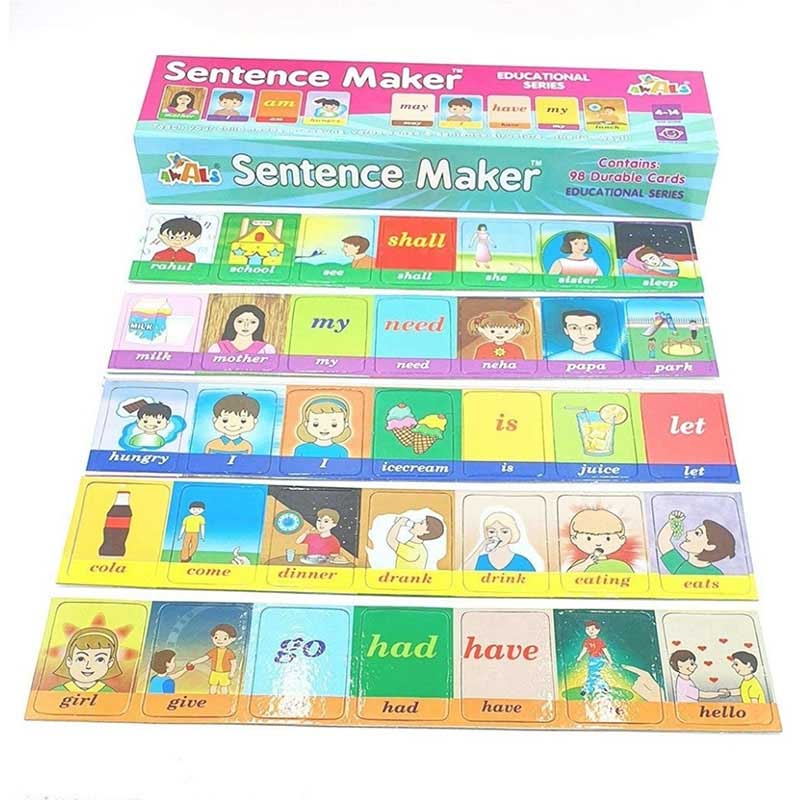 “Sentence Maker” is an innovative DIY educational kit for kids. Build a sentence after practicing the alphabets and word building, children must learn and practice sentence forming. Simple sentences deals with basic sentence construction. Along with building vocabulary, the child learns the placing of nouns, verbs, adjectives, articles and prepositions in a sentence. A “Sentence Maker” introduces children to the two important parts of a sentence, Subject and Predicate. Children build tons of sentences, no matter how silly their meaning, by joining them given large Subject and Predicate Cards in different combinations. It makes sentence formation easier with sound grammatical knowledge. These informative cards help the child learn more than just English alphabet sentences. It includes 98 Subject cards an Activity Guide for individual use, teachers, parents and an ideal and unique gift too!